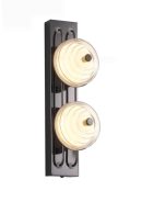 - Sleek Dark Backplate: A prominent rectangular backplate in a dark, polished metallic finish (black/dark bronze) provides a strong modern foundation for the lights.