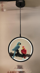 - Illuminated LED Ring: A slender, minimalist black metal ring elegantly encircles the parrot scene, featuring integrated LED lighting along its inner circumference. This creates a halo of soft, uniform light that beautifully frames the central nature motif.